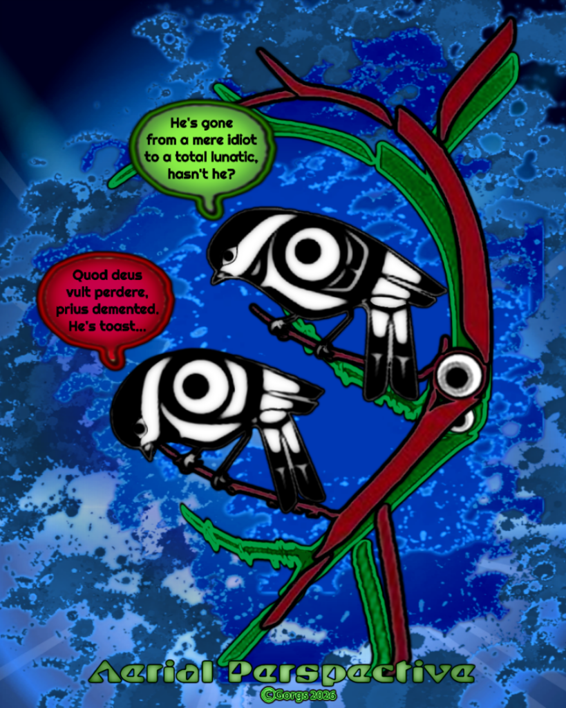 Of course my (and the birdies’) point of view and Craig’s analysis are not incompatible. After all this kind of corrupt, evil “intelligence” is but another aspect of both stupidity and madness. And yes, possibly he is toast but, Bumba forfend!, it’ll be only to get something worse, like J. D. Vance.